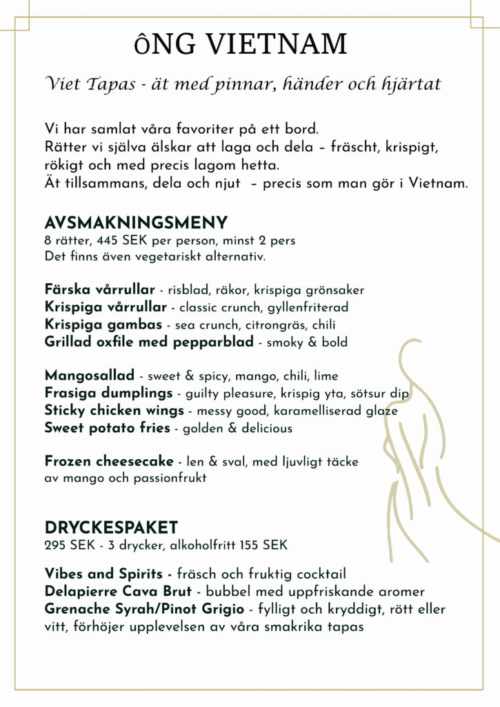 Samla vännerna och dela på något riktigt gott! Vår avsmakningsmeny bjuder på små, kärleksfullt tillagade rätter fyllda med autentiska smaker och färska ingredienser. Perfekt för en smakresa genom Vietnams livliga matkultur, mitt i Stockholm!